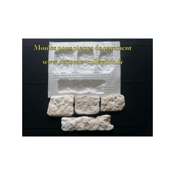Ce pack complet regroupe 20 moules pour pierres et plaquettes de parement comprenant 48 empreintes de tailles et formes différentes, permettant de couvrir environ 1 m² de surface de parement au démoulage.